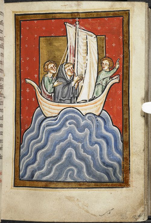 Miniature of St Cuthbert in a boat at sea, with two other men, from Chapter 11 of Bede’s prose Life of St Cuthbert, England (Durham), 4th quarter of the 12th century, Yates Thompson MS 26, f. 26r. [britishlibrary.typepad.co.uk]