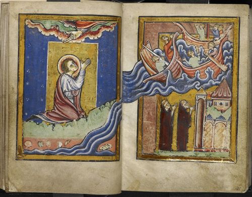 St Cuthbert praying to God to change the winds beside the river Tyne; two monks at the monastery of Tynemouth praying for the safety of those blown away in a gale, from Chapter 3 of Bede’s prose Life of St Cuthbert, England (Durham), 4th quarter of the 12th century, Yates Thompson MS 26, ff. 10v-11r. From A Menagerie of Miracles: The Illustrated Life of St Cuthbert on the British Library Medieval Manuscripts blog.