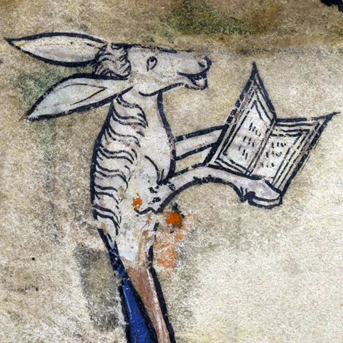 ABBEVILLE, Bibliothèque municipale, manuscrit 003 Psalter 13th-14th century. The “donkey reading” image is number 24 if you follow the link, hope the link works! http://bvmm.irht.cnrs.fr/consult/consult.php?mode=vignettes&reproductionId=15027&VUE_ID=-1&panier=false&carouselThere=false&nbVignettes=tout&page=1&angle=0&zoom=&tailleReelle= LikeLiked by 1 person