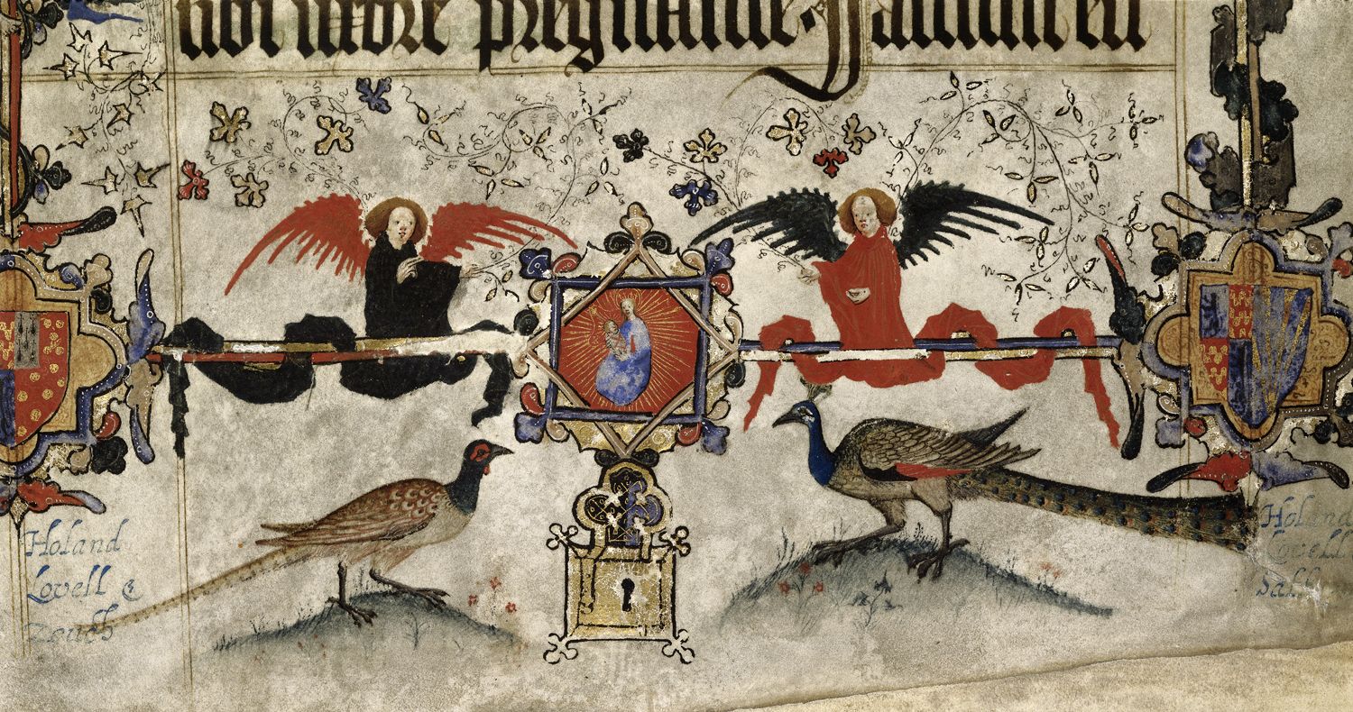 Detail from the border at the lower edge of the page: angels with an icon of the Virgin and Child, a pheasant and a peacock. England, S. (probably Glastonbury); between c. 1400 and c. 1410. British Library, MS Harley 7026, fol. 5. British Library.