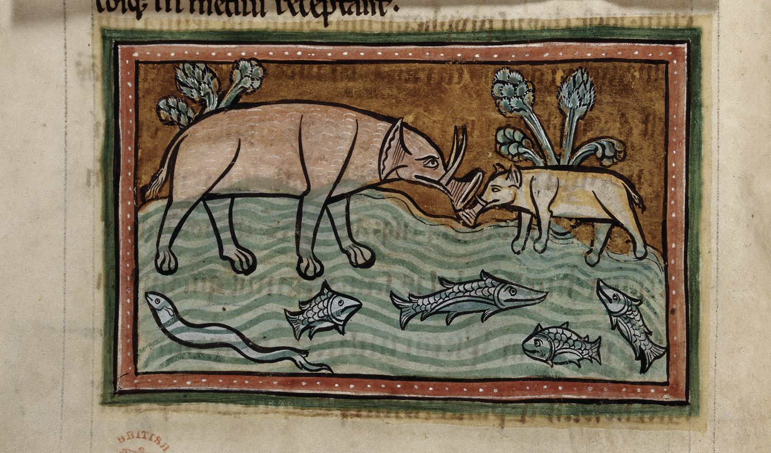 ēa-fisc Posted on March 23, 2016 by Hana Videen ēa-fisc, m.n: a river-fish. (AY-ah-FISH / ˈeːa-ˌfɪʃ) Detail of a miniature of one big and one small elephant in a stream full of fish. England, S. E. (possibly Rochester), 2nd quarter of 13th century. British Library, Royal 12 F XIII, f. 13v. Share this:Share Email a link to a friend (Opens in new window) Email Share on Facebook (Opens in new window) Facebook Share on X (Opens in new window) X Share on Tumblr (Opens in new window) Tumblr Like Loading... Related