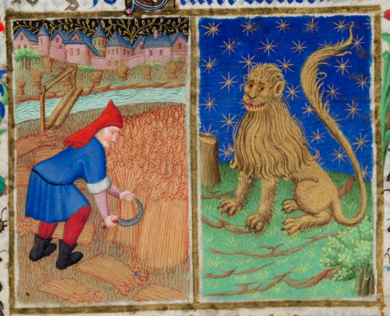 mǣd-mōnaþ Posted on July 3, 2016 by Hana Videen mǣd-mōnaþ, m.n: July. (MAD-MO-nath / ˈmæːd-ˌmoː-naθ) Detail of a man scything wheat and the zodiac sign Leo on a calendar page for July. From the Bedford Hours, France (Paris), c. 1410-1430. British Library, Add MS 18850, f. 7r. See British Library blog post. Share this:Share Email a link to a friend (Opens in new window) Email Share on Facebook (Opens in new window) Facebook Share on X (Opens in new window) X Share on Tumblr (Opens in new window) Tumblr Like Loading... Related