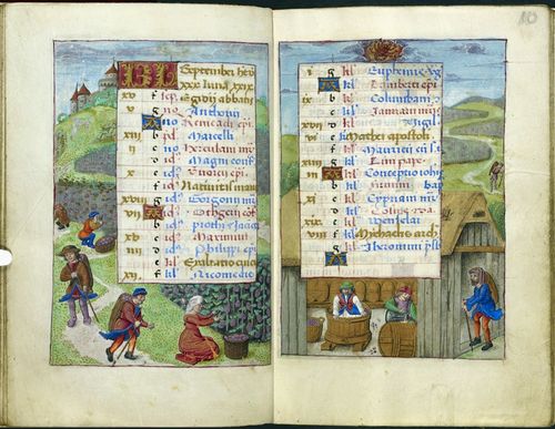 Calendar pages for September, from the Hours of Joanna of Castile. Netherlands (Bruges), between 1496 and 1506. British Library, Additional 18852, ff. 9v-10. [blogs.bl.uk]