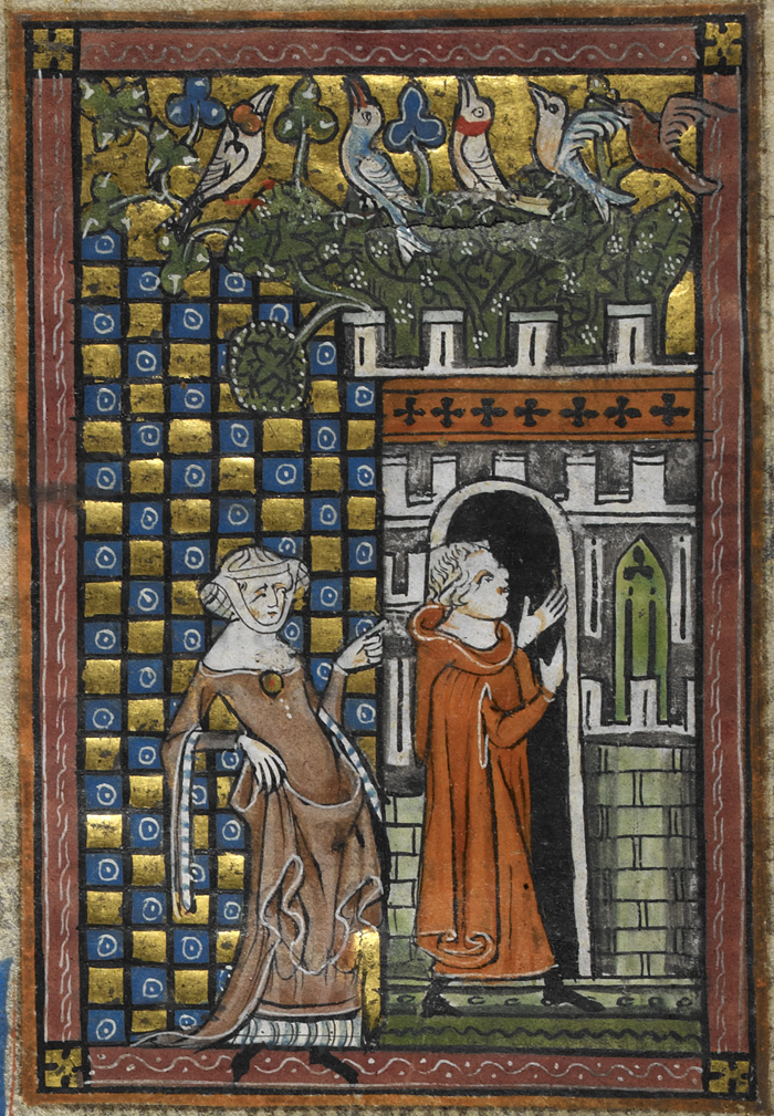 bæftan-sittende Posted on October 6, 2016 by Hana Videen bæftan-sittende, adj: idle (back-sitting). (BAV-tahn-SIT-ten-duh / ˈbæv-tan-ˌsɪt-tɛn-də) Idleness shows the Lover into the Garden of Pleasure. Guilluame de Lorris and Jean de Meun, Roman de la Rose. France (Artois or Picardy), c. 1340. British Library, Royal MS 20 A. xvii, fol. 7v. [bl.uk/manuscripts] Share this:Share Click to email a link to a friend (Opens in new window) Email Click to share on Facebook (Opens in new window) Facebook Click to share on X (Opens in new window) X Click to share on Tumblr (Opens in new window) Tumblr Like Loading... Related