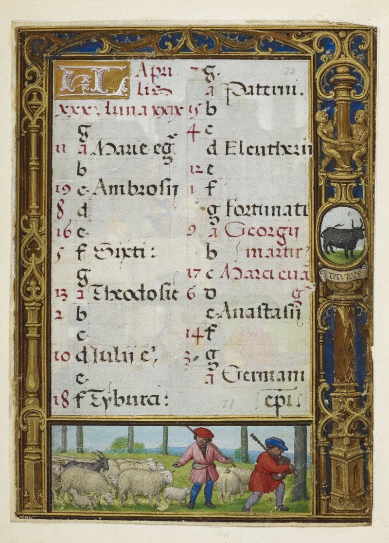 Calendar page for April with a bas-de-page scene of shepherds, from the Golf Book. Workshop of Simon Bening, Netherlands (Bruges), c. 1540. British Library, Additional MS 24098, f. 22r. [blogs.bl.uk]