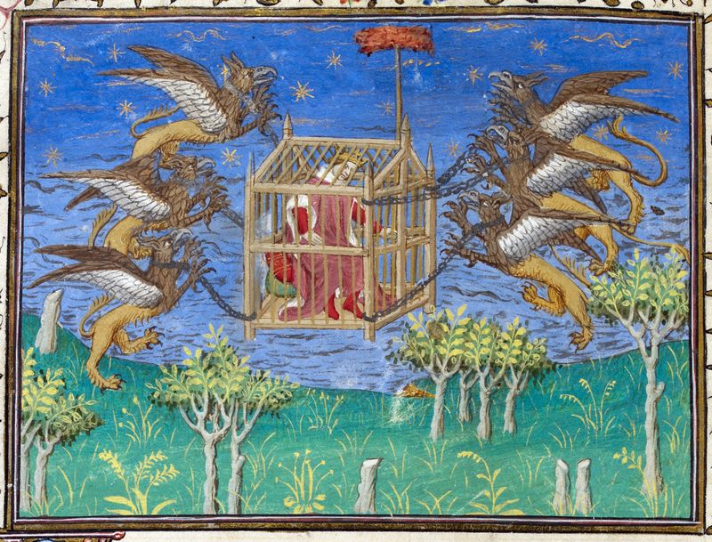Alexander the Great in a cage, being carried aloft by griffins in Le Livre et le vraye hystoire du bon roy Alixandre. France (Paris), c. 1420. London, British Library, Royal 20 B XX, f. 76v. [bl.uk]