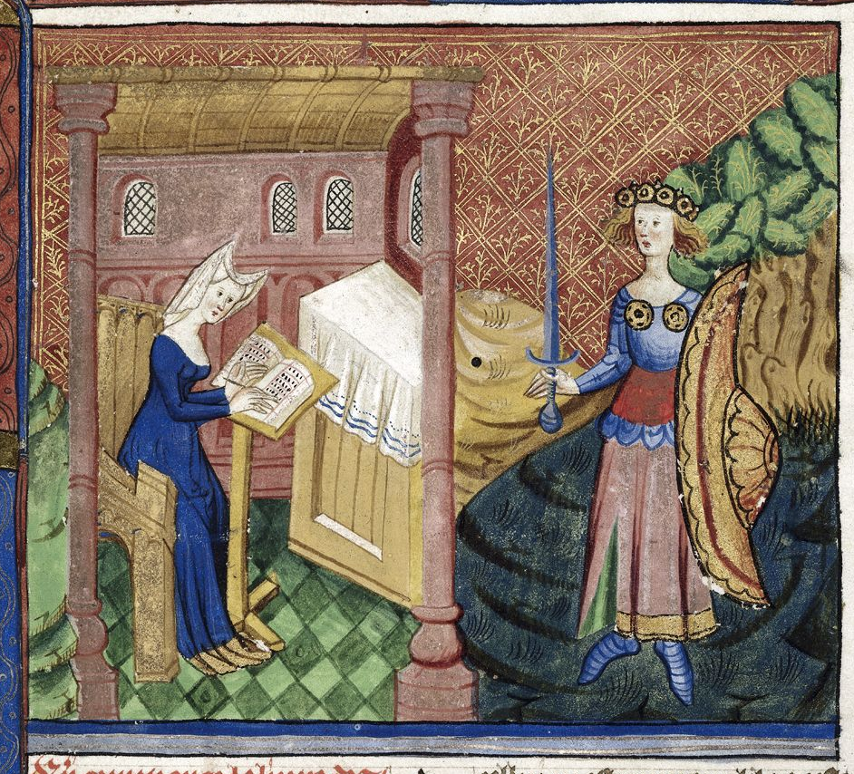 Christine de Pisan sits at her desk while Minerva (goddess of Wisdom) stands nearby, carrying her sword and shield of truth. Christine de Pisan’s Le livre des faits d’armes et de chevalerie. England (London), 1434. London, British Library, Harley 4605, f. 3. [bl.uk]