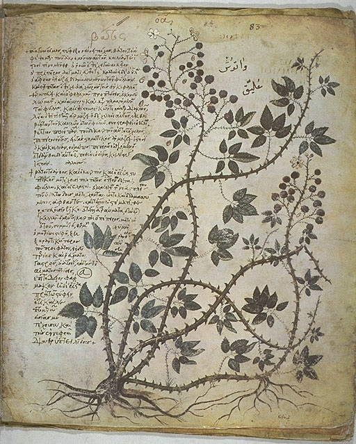 European bramble from the Vienna Dioscurides, an early 6th-century Byzantine Greek illuminated manuscript of De Materia Medica. Vienna, Österreichische Nationalbibliothek, Codex Vindobonensis med. gr. 1, f. 83r. [en.wikipedia.org]