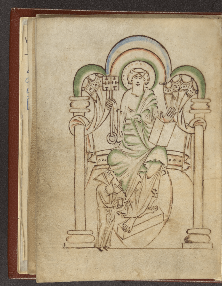 St Peter with a monk at his feet. Ælfwine’s Prayerbook. England (New Minster, Winchester), 1020s. British Library, Cotton MS Titus D XXVI, f. 19v. [blogs.bl.uk]