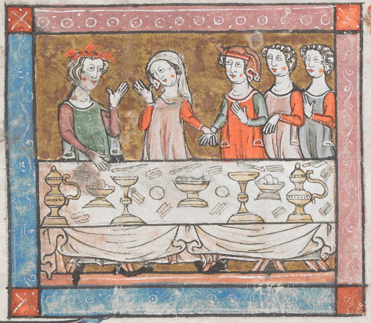 mete Posted on January 11, 2022 by Hana Videen mete, m.n: food. (MEH-tuh / ˈmɛ-tə) Lancelot-Grail (Prose Vulgate Cycle); N France (Saint-Omer or Tournai), 1316; British Library, Add MS 10293, f. 376r. [bl.uk] Share this:Share Click to email a link to a friend (Opens in new window) Email Click to share on Facebook (Opens in new window) Facebook Click to share on X (Opens in new window) X Click to share on Tumblr (Opens in new window) Tumblr Like Loading... Related