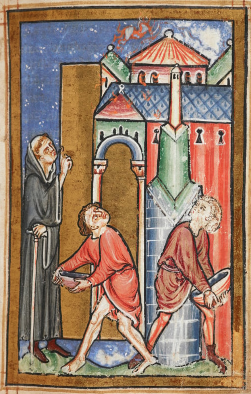 Cuthbert extinguishing a fire set by a demon in Bede’s Prose Life of St Cuthbert; England (Durham), late 12th century; British Library, Yates Thompson MS 26, f. 30r. [picryl.com]