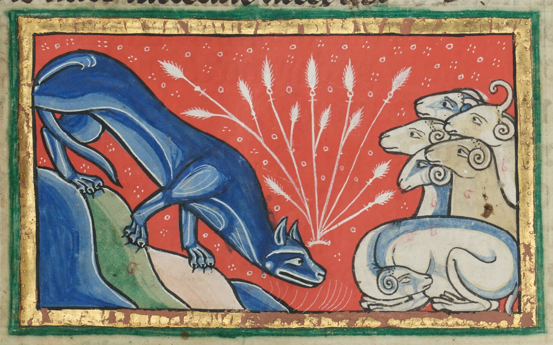 hergung Posted on November 17, 2025 by Hana Videen hergung, f.n: plundering, pillaging, looting, ravaging. (HER-gung / ˈhɛr-gʌŋ) A wolf sneaking up on some sheep in a bestiary; England (York), 1200-1215; Oxford, St John’s College Library, MS 61, f. 21r. [digital.bodleian.ox.ac.uk] Share this:Share Click to email a link to a friend (Opens in new window) Email Click to share on Facebook (Opens in new window) Facebook Click to share on X (Opens in new window) X Click to share on Tumblr (Opens in new window) Tumblr Like Loading... Related