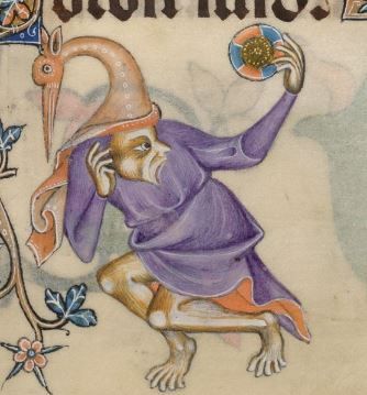 An image in dark-brown of the devil and cat worshippers kissing a cat’s rear end. Jean Tinctor, Traittié du crisme de vauderie (Sermo contra sectam vaudensium). Bruges, c. 1470-1480. Paris, Bibliothèque nationale de France, Français 961, fol. 1r. [discardingimages.tumblr.com]
