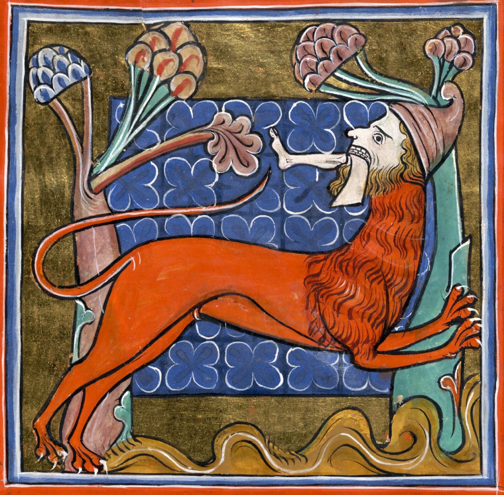 The Virgin Mary beats up a devil; an angel carrying a rescued soul observes. The Taymouth Hours. England (London?), 14th century. British Library, Yates Thompson 13, f. 155v. [bl.uk]